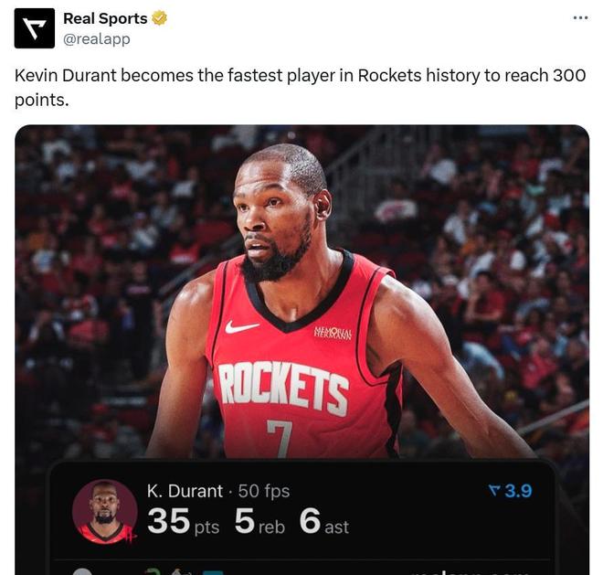 其次本场比赛结束后,杜兰特火箭队生涯总得分突破300,成为火箭队史拿下300分最快的球员,仅用12场比赛。