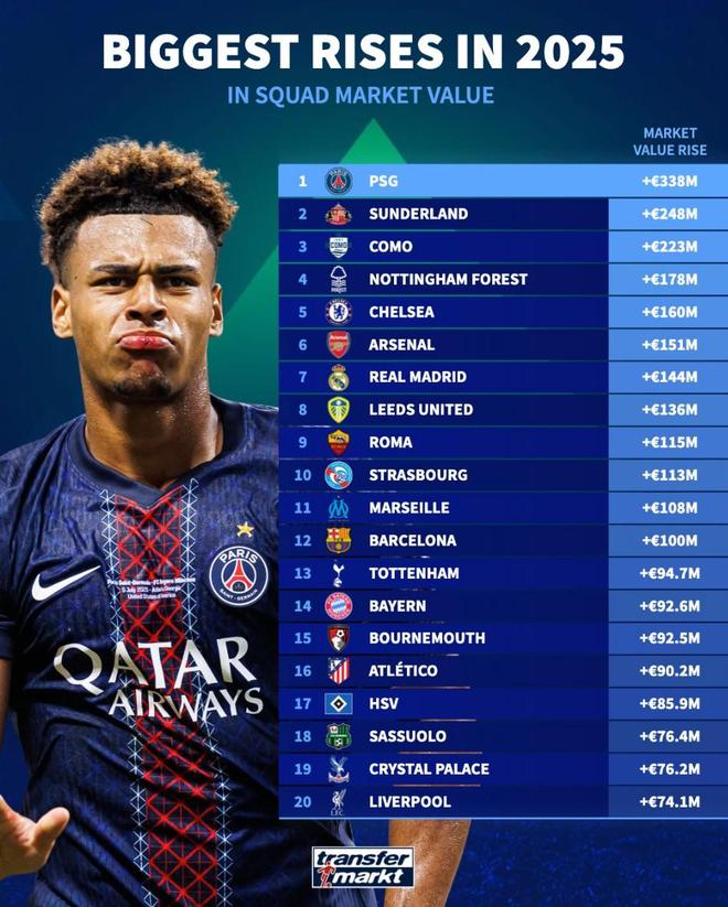 北京时间12月28日,德转列出了2025年身价涨幅最高的20家俱乐部,巴黎圣日耳曼上涨3.38亿欧元高居第一,切尔西、阿森纳、皇家马德里、巴塞罗那、拜仁慕尼黑以及利物浦也都榜上有名。